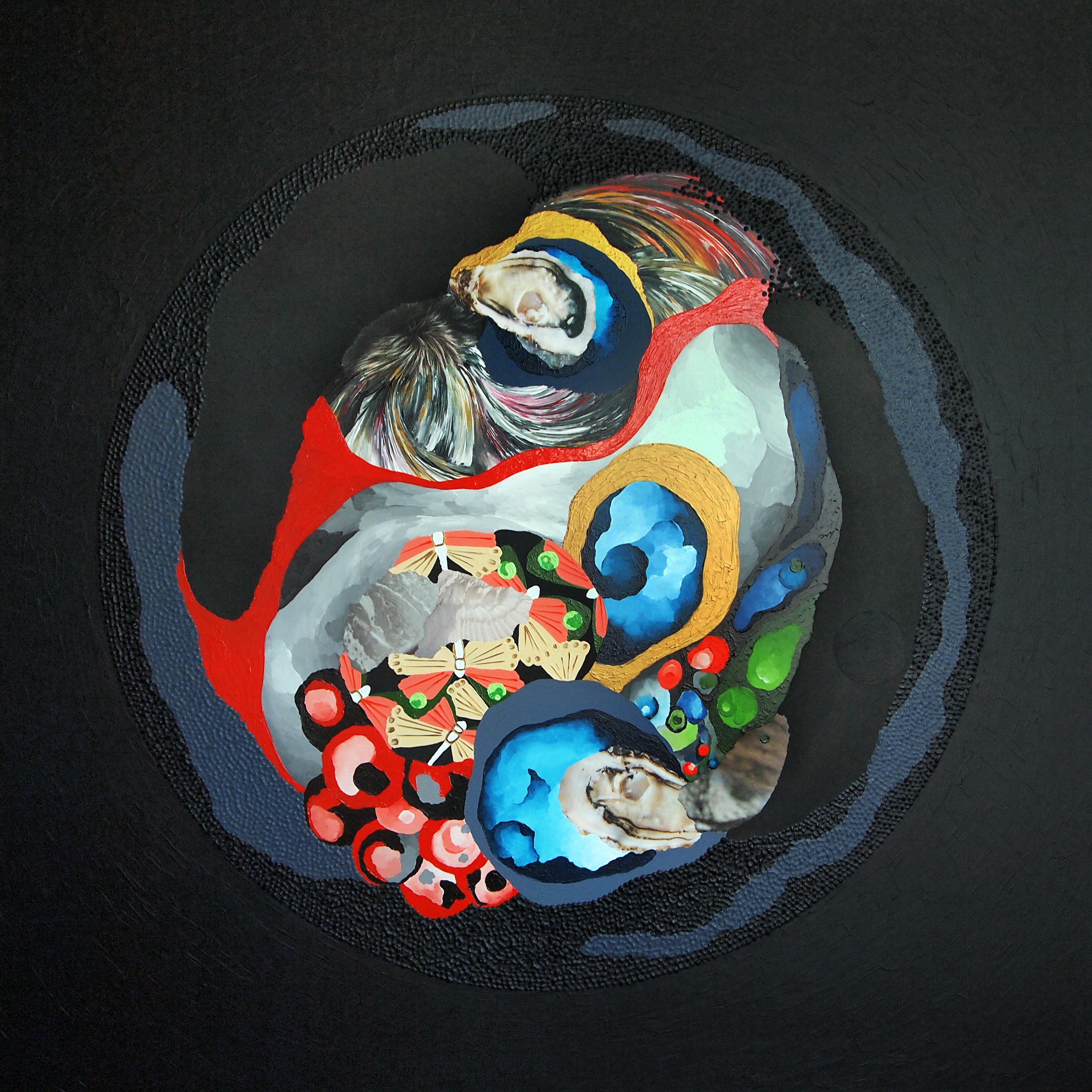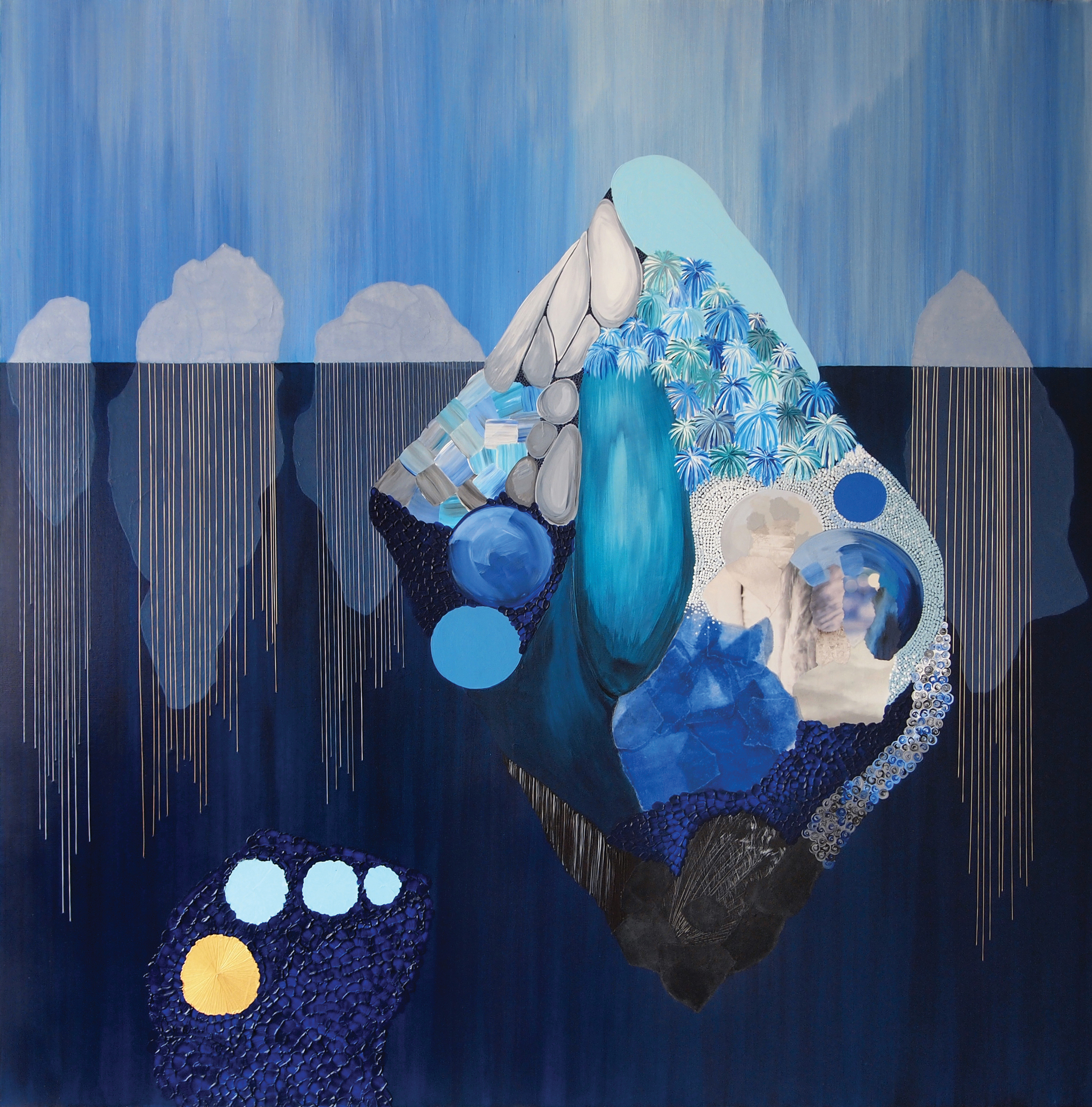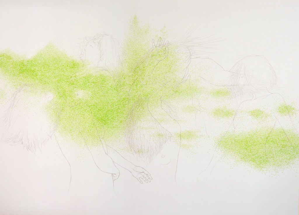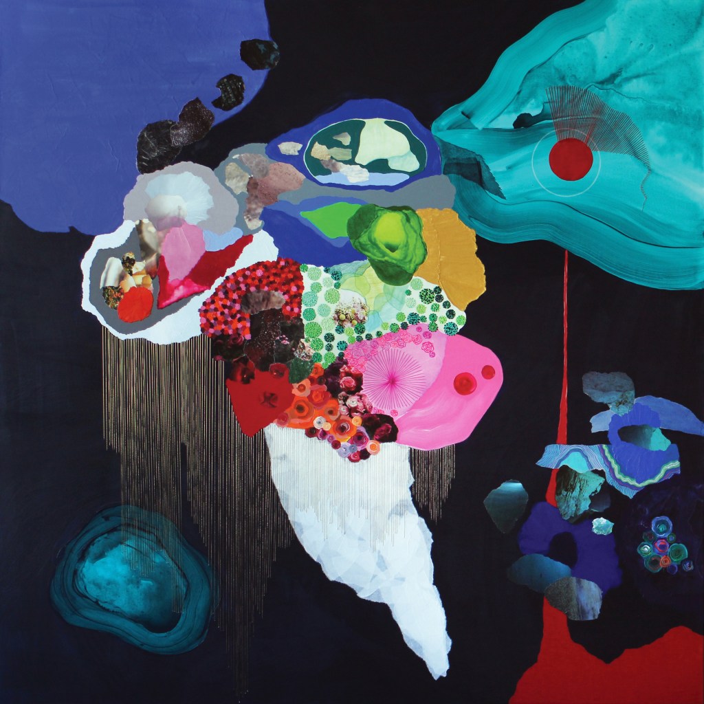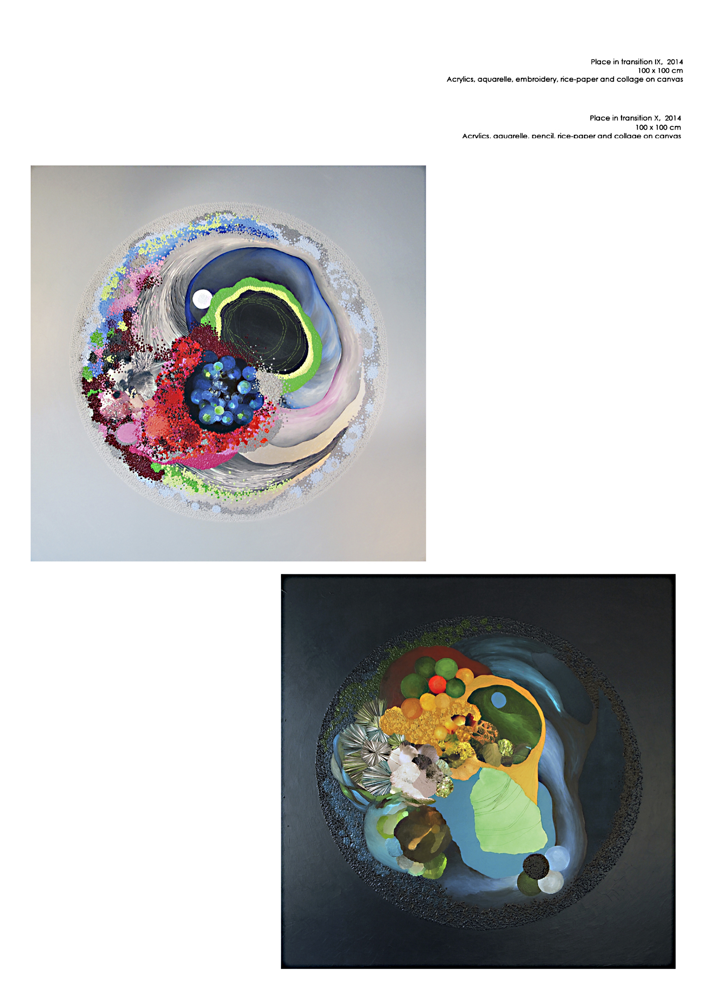 Paisajes en el otro lado muestra un grupo de representaciones que recogen una visión de aquello que la mirada captura cuando se filtra en el otro lado, en un dominio donde la frontera entre lo visible y lo invisible se difumina. Jardines, tierras volcánicas, tierras heladas y océanos se originan en el imaginario integrador de reminiscencias sensoriales y posibilidades físicas. Su imagen encuentra un cuerpo donde encarnarse en un proceso de exploración formal orientado a descubrir las formas que viven bajo las formas. Se trata de la búsqueda de un orden donde una antigua realidad puede tomar un nuevo sentido; es el diálogo con la forma, hecho de ruidos y de silencios y de las texturas que su huella revela, el que lo hace posible. Como los ritmos del cuerpo, la naturaleza o la experiencia, los ritmos formales crecen sobre el plano definiendo la topografía de estos paisajes en el otro lado. En un momento es la provocación de un trozo de imagen encontrada en una revista, en otro la espontaneidad de una mancha de tinta, el sonido del trazo del lápiz sobre el papel de arroz, el tacto del bordado con hilos, la luz de un color o el misterio de una veladura… en cada rincón del paisaje se esconde una impresión y cada material se torna una particular herramienta en el proceso de revelar su vida interna, cada uno con su propio gesto que lo hace único participa en explicar los detalles de la experiencia.