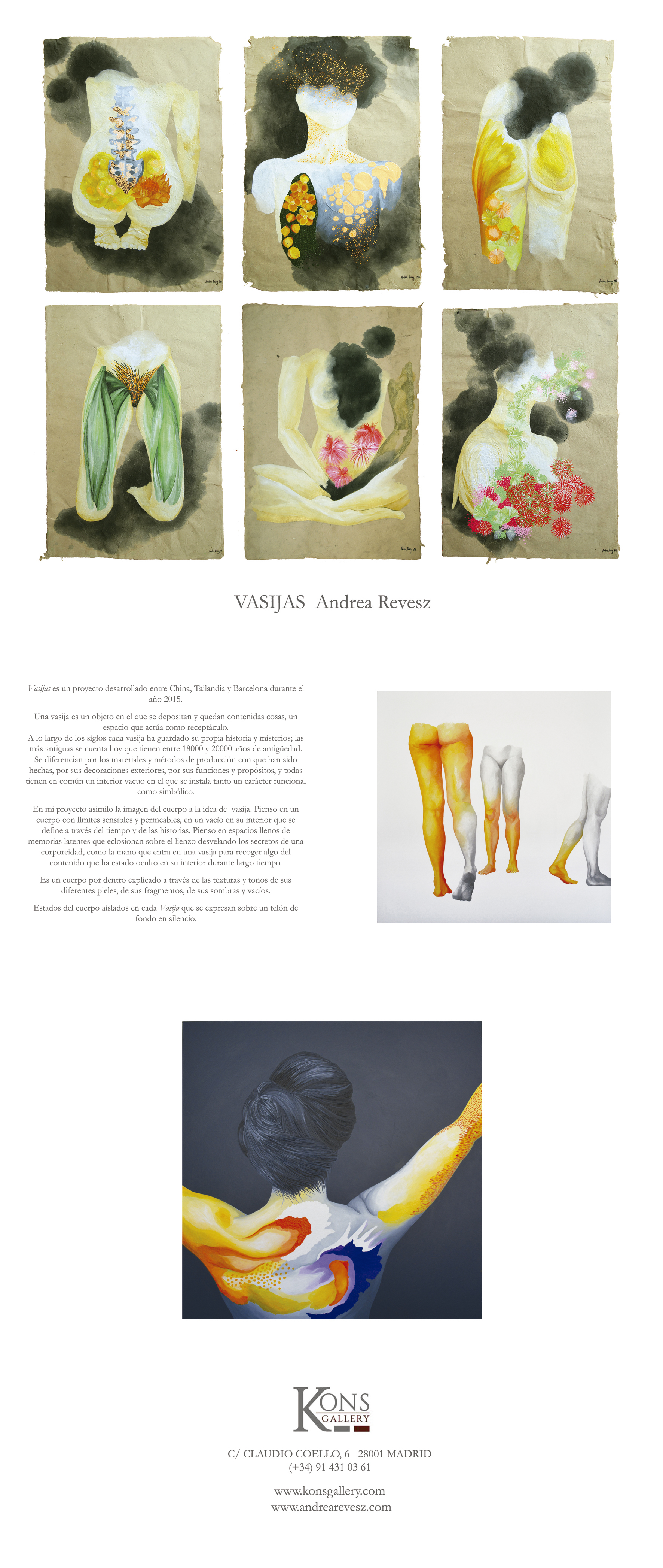 VASIJAS es un proyecto en el que la imagen del cuerpo se asimila a la idea de vasija. Una vasija es un objeto en el que se depositan y quedan contenidas cosas, un espacio que actúa como receptáculo. A lo largo de los siglos cada vasija ha guardado su propia historia y misterios. Las vasijas se diferencian por los materiales y métodos de producción con que han sido hechas, por sus decoraciones exteriores, por sus funciones y propósitos, y todas tienen en común un interior vacuo en el que se instala tanto un carácter funcional como simbólico.